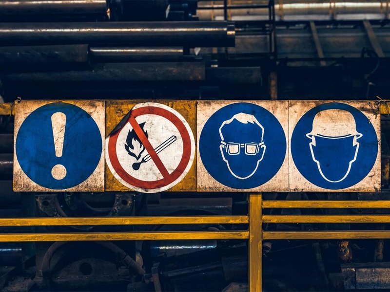 Helmet zone, safety shoes required, mask mandatory, etc.
